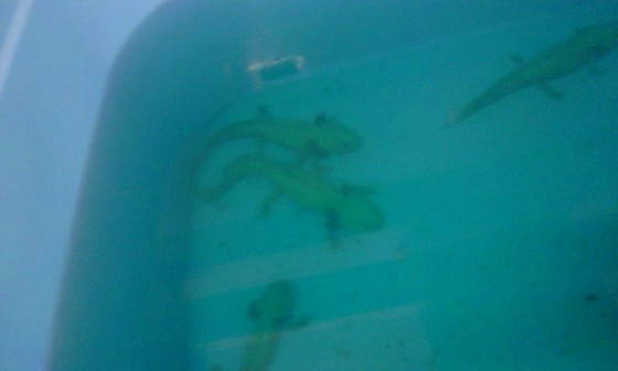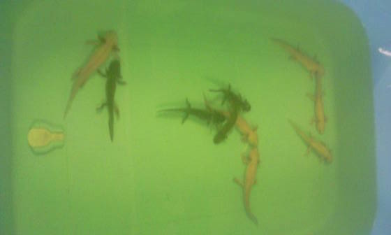 | 当社でウーパールーパーを飼育していて一番多い病気は皮膚病だと思います。 【予想される原因】 こちらは獣医師ではございませんので、詳しくは不明ですが、環境の変化によるストレスが原因で、免疫力が低下し、細菌により皮膚病が起こると思います。季節の変わり目に起こっているように思います。 (夏場でしたら水温が高いと同じような症状になります) 【対処法】 参考例 ![]() ニューグリーンFを使用した場合(希釈は適量) ![]() グリーンFゴールドを使用した場合(希釈は適量) |